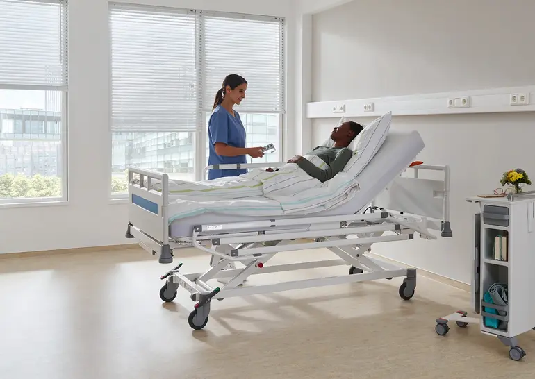 - Le panneau se déplace avec le relève-buste lorsque celui-ci est réglé, ce qui garantit une accessibilité idéale sur le Point of Care