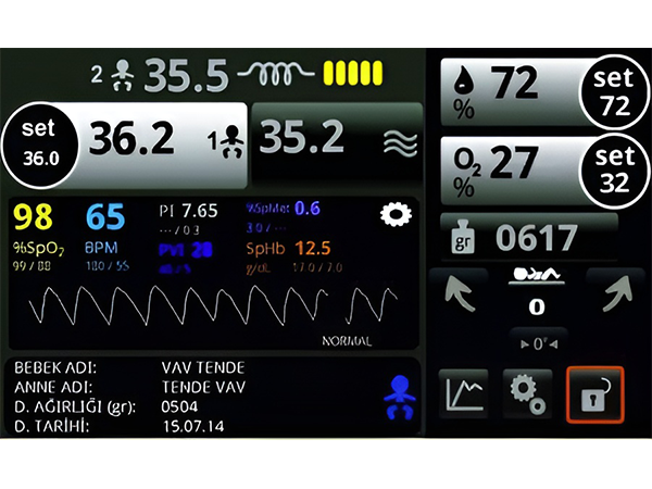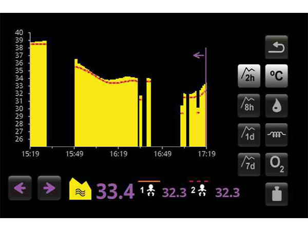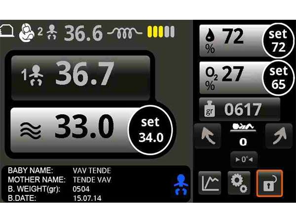Les cliniciens peuvent observer toutes les températures de l'air et de la peau, les niveaux d'humidité et d'oxygène, le poids du bébé et la puissance de chauffage de l'incubateur sur les deux écrans pendant 2 heures, 8 heures, 1 jour et 7 jours, sous forme de graphiques et de valeurs numériques. Il est possible de voir les tendances sur 1 jour et 7 jours avec une résolution de 1 minute sur l'écran